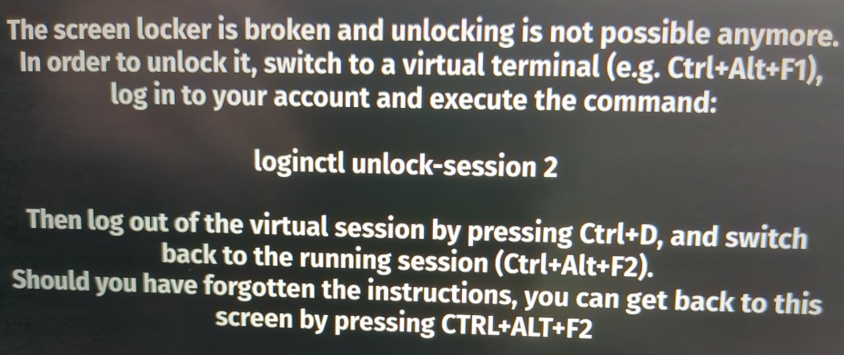 Check-box Laptop slept for a while, then I came back to find it in a weird state, keyboard has caps-lock flashing and a touchpad light on that never is on, screen is black. System is stuck; had to hard-reset. Happened again a day later: sleeping in black screen, hit a key to wake it up, caps-lock started flashing, system is stuck, had to hard-reset. Nothing useful in system journal. Kernel is 6.4.10-zen1-1-zen. Happened a third time, it's about once a day: black screen, flashing caps-lock, had to hard-reset. Happened a 4th time. Happened a 5th time on same day: was in black screen, hit Enter, caps-lock started flashing, system is stuck. Tried turning off "Settings / System Settings / Power Management / Energy Saving / Suspend Session". System got stuck again. And again (after closing lid; maybe I shouldn't do that). Happened a couple more times. Didn't happen for a week or so, then happened a couple more times. Updated to kernel 6.5.2. Happened again. And again. Updated to kernel 6.5.3. Happened a couple more times, maybe less often. Updated to kernel 6.5.5. Happened again. And again. May have found a way to avoid the problem: never plug or unplug the AC power while laptop is sleeping. Updated to kernel 6.5.7. Problem still happens, less frequently after doing power trick. Updated to kernel 6.5.8. Seemed better for a while. To kernel 6.5.9. Then once got a big message "your screen-locker is broken, login to a console session and type loginctl unlock-session 2". That worked. But soon had a crashed desktop after sleeping: was able to log in, but all my apps have been closed. To kernel 6.6.2. Got the "screen locker broken" screen (pic) again, got back to desktop, but afterward could not launch any apps. To kernel 6.6.6. And somewhere around here the problem seemed to stop happening.
