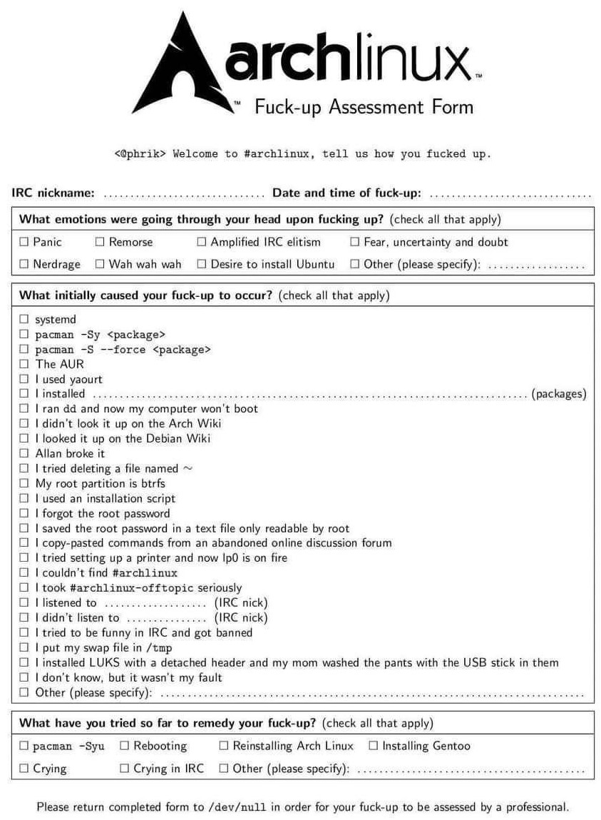 Arch Linux F*ck Up Assessment Form